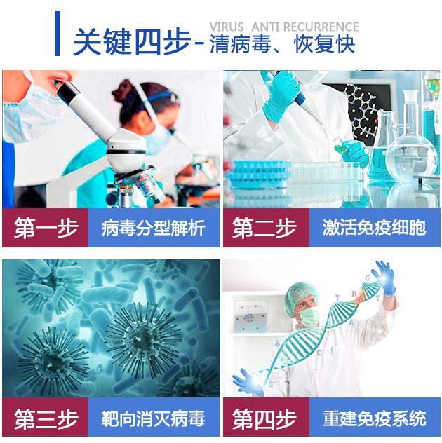 “三位立体”疗法遵循抗病毒、靶向治疗理念与分子免疫学原理,运用多项医学诊疗设备和抗病毒药物,根据每个患者的检查结果和患病情况,选择最适合患者的诊疗方案,可破坏病毒的生物链,高效靶向性杀灭体内潜伏病灶,同时重建机体免疫系统,增强机体抗病毒修复功能,修复受损组织,提高抗病能力,让病毒无法复制、修复和生存,最终达到科学治疗不复发的目的。
